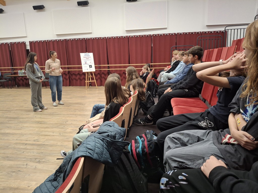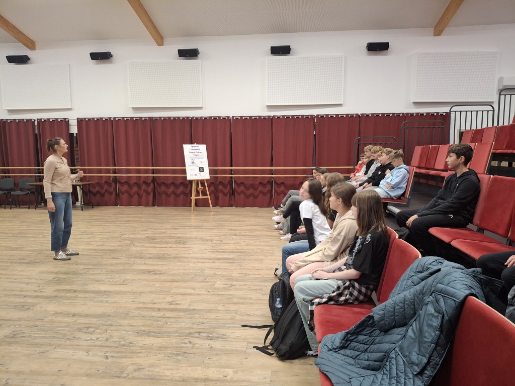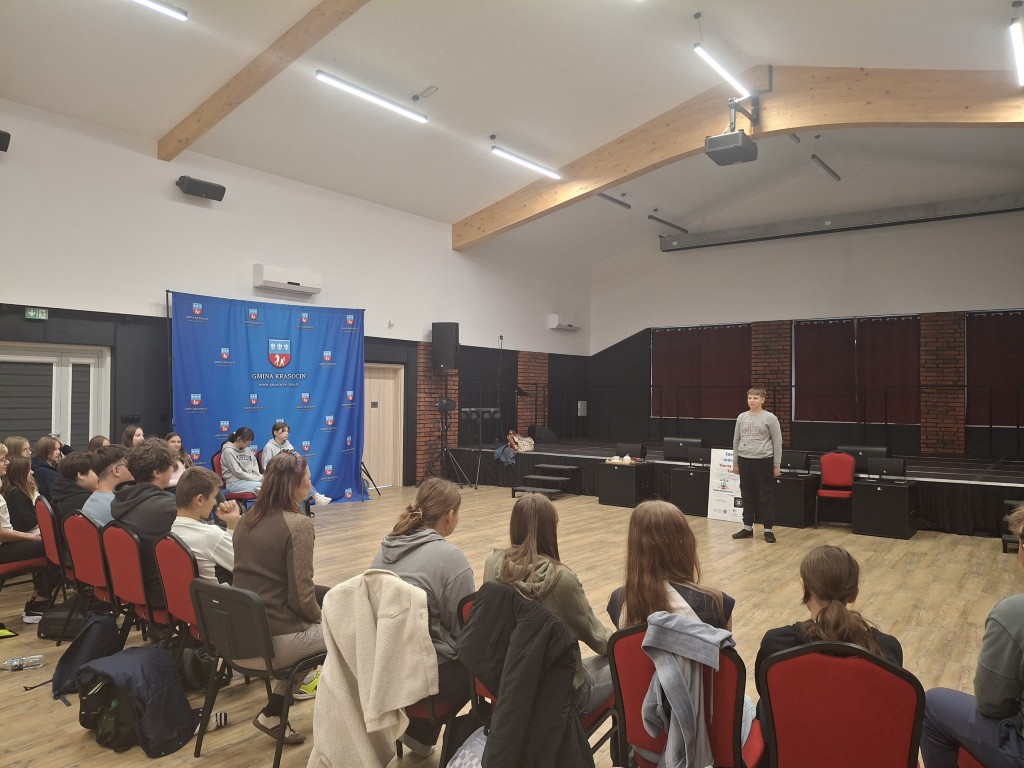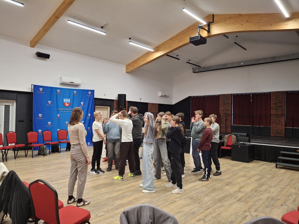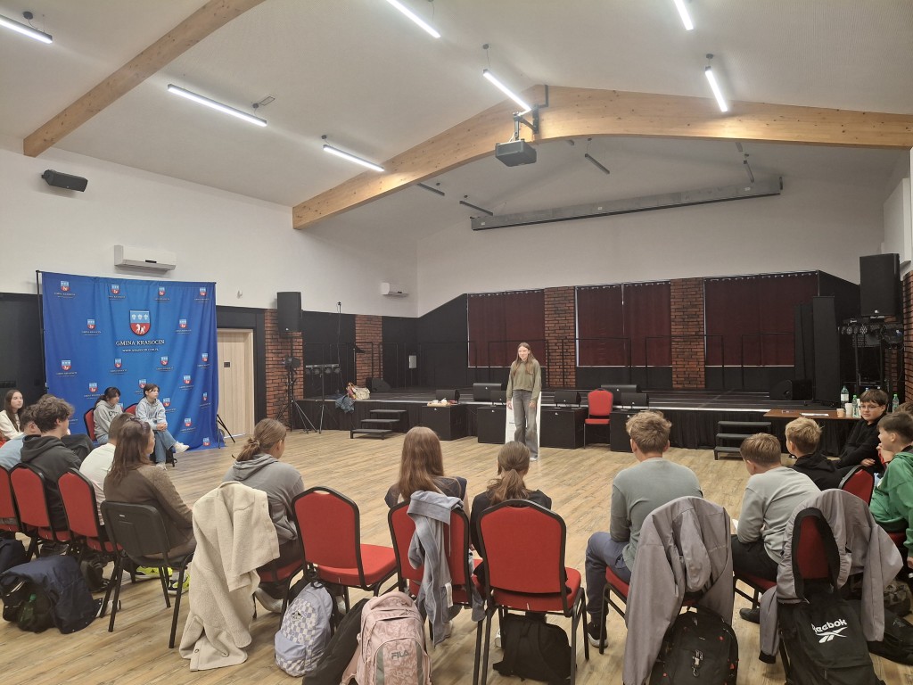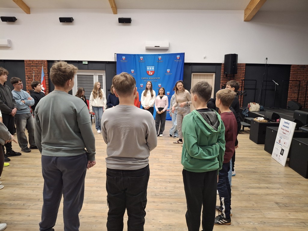 Projekt „Spełniaj marzenia – Young Culture Team” w ramach programu Bardzo Młoda Kultura 2025 powoli dobiega końca. Za nami już warsztaty emisji głosu i występów publicznych, podczas których młodzież z klas siódmych ze Szkoły Podstawowej w Krasocinie uczyła się pracy nad głosem, postawy ciała i gestykulacji podczas wystąpień, czyli wszystko, o czym powinniśmy pamiętać przemawiając na forum do innych. Warsztaty poprowadziła Ewa Lubacz – aktorka Teatru Lalki i Aktora „Kubuś” w Kielcach im. Stefana Karskiego, szczudlarka, pedagog teatru, prezenter radiowy (Radio Em Kielce, Radio Kielce).