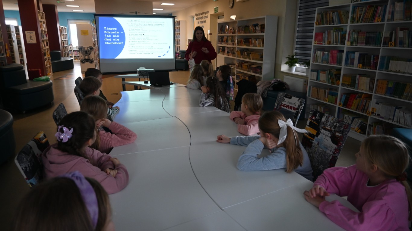 W piątek, 23 stycznia 2026 r., w naszej bibliotece odbyło się spotkanie edukacyjne pt. Bezpieczne ferie 2026, które poprowadziła Pani Olga Matyśkiewicz z Powiatowej Stacji Sanitarno-Epidemiologicznej we Włoszczowie. Dzieci dowiedziały się na spotkaniu m.in. jak dbać o zdrowie i chronić się przed chorobami, przypomniały sobie zasady higieny osobistej oraz podstawy prawidłowego odżywiania. Pani Olga przypomniała także o bezpiecznym korzystaniu z Internetu i zagrożeniach, jakie czekają na najmłodszych podczas surfowania w sieci).